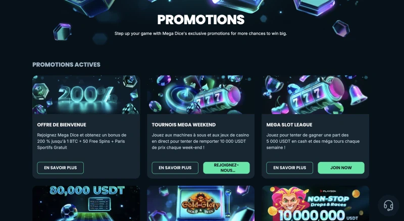 Sur cette page, nous expliquons comment fonctionnent nos promotions chez MegaDice Casino et comment les joueurs en France peuvent les réclamer de manière claire et pratique. Vous verrez l’offre de bienvenue, les options de cashback en cours, et la façon dont les tournois s’intègrent à votre jeu. Nous expliquons aussi où utiliser un code promo MegaDice et quelles étapes comptent le plus avant d’activer une offre.
