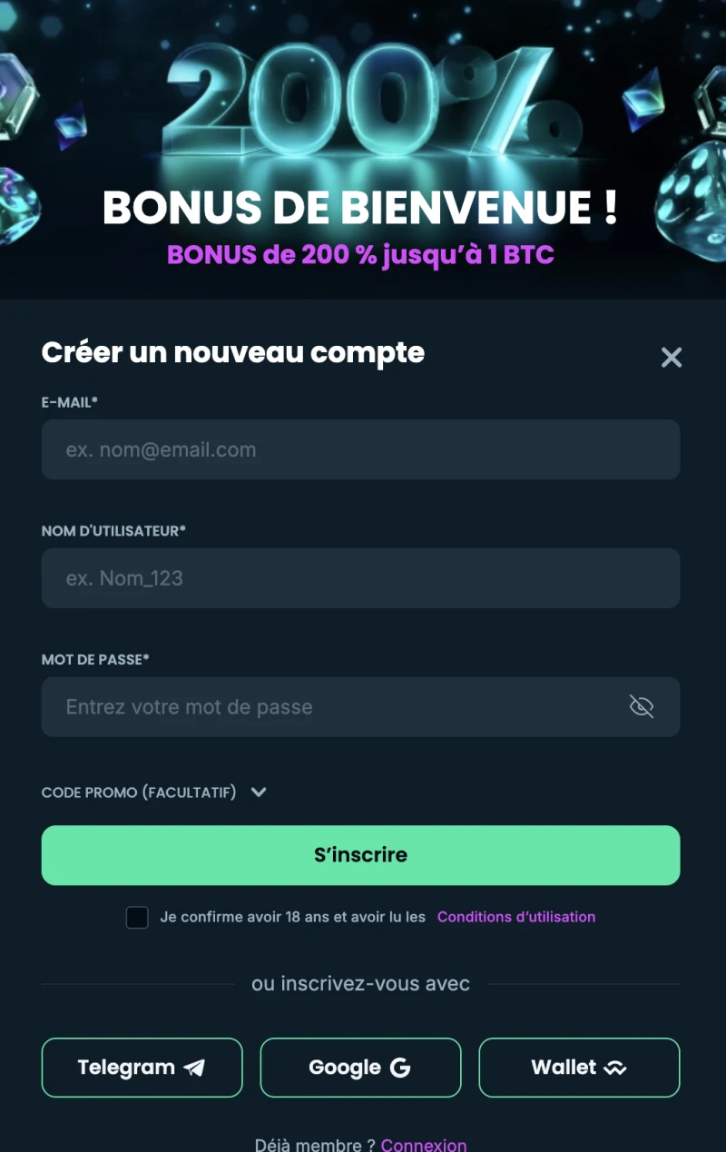 Au départ, vous pouvez choisir une offre de bienvenue casino, une option de bienvenue sports, ou continuer sans bonus. Nous affichons un bref aperçu des conditions afin que vous compreniez le dépôt minimum et les règles de mise (wagering) avant d’accepter. Si vous avez un code promo, vous pouvez le saisir ici. Si un bonus sans dépôt MegaDice casino est indiqué dans Promotions, les limites exactes et les règles de jeu seront affichées avant votre adhésion.